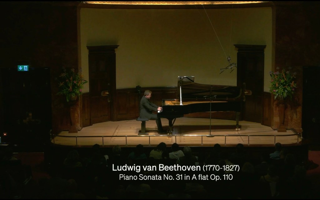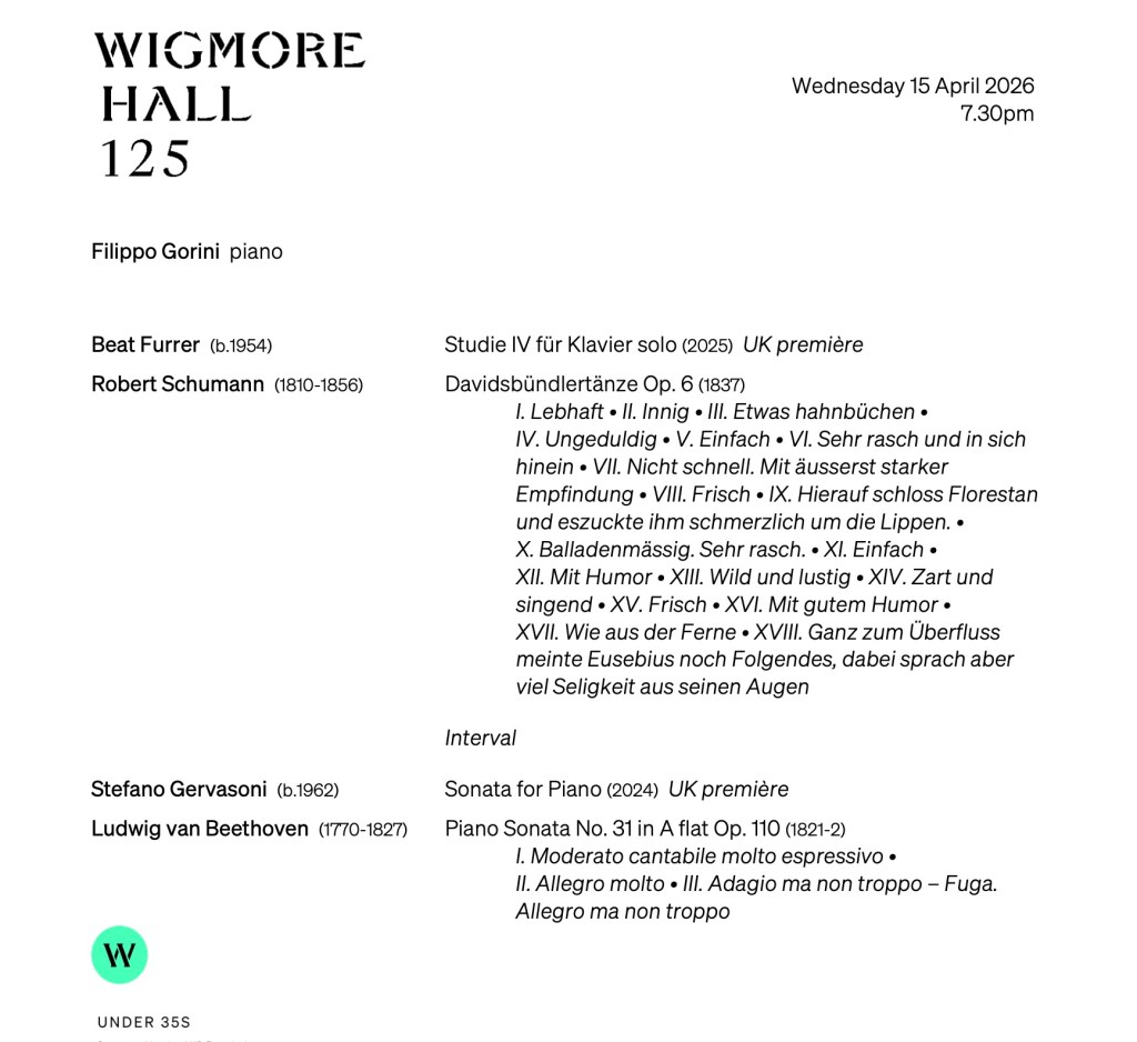 A monumental performance of Beethoven’s penultimate sonata played with radiance and beauty. Unfolding with waves of sound linking moments of deeply felt poignancy as Filippo played with a simplicity but also at times with an innermost turbulence. He could bring magic moments to the transitions or changes of key without ever underlining what Beethoven has written in the score. An awareness that was touched with Godliness. This was a performance where so little could mean much. Great buoyancy to the ‘Scherzo’ also played quite simply and legato with the delicate return of the ‘Scherzo’ after the masterly control of the ‘Trio’. A stillness to the ‘Adagio’ as it unfolded to an aria that was remarkably free, allowed to breathe as a singer, where fluctuations of the heart beating in the left hand were allowed more liberty to accompany rather than as an anchor. A poignant whispered entry of the fugue and an even more intense return of the aria leading to powerful chords of great inner turbulence before the whispered return of the fugue in inversion. A gradual increase in volume as Filippo allowed this joyous outpouring of passionate intensity to fill the hall with the vision of beauty that Beethoven could already envisage. A masterly performance from a thinking musician who could delve deeply into the score as indeed Brendel had shown us and whose heritage has been passed on to his disciple Filippo Gorini, as the the voyage continues!
