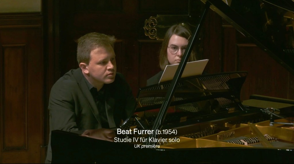 In the words of the composer :’ Its opening idea is a percussive interplay of note clusters, slowly rising from the middle of the keyboard, with stabbing interruptions from the outer extremes of the piano’s register. Fast downward-sliding figures follow, murky and low. These descending gestures expand in range, gathering strength and complexity until they resound like a vast peal of bells. There is a temporary respite of short, sharp chords, before further whirling patterns and variations on earlier material. But all this technical display falls away in an eerily sparse coda. With almost every note given its own precise dynamic marking, Studie IV concludes with anexploration of subtly differentiated tone colours.’