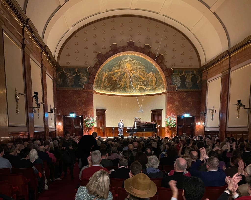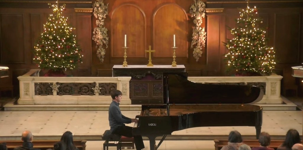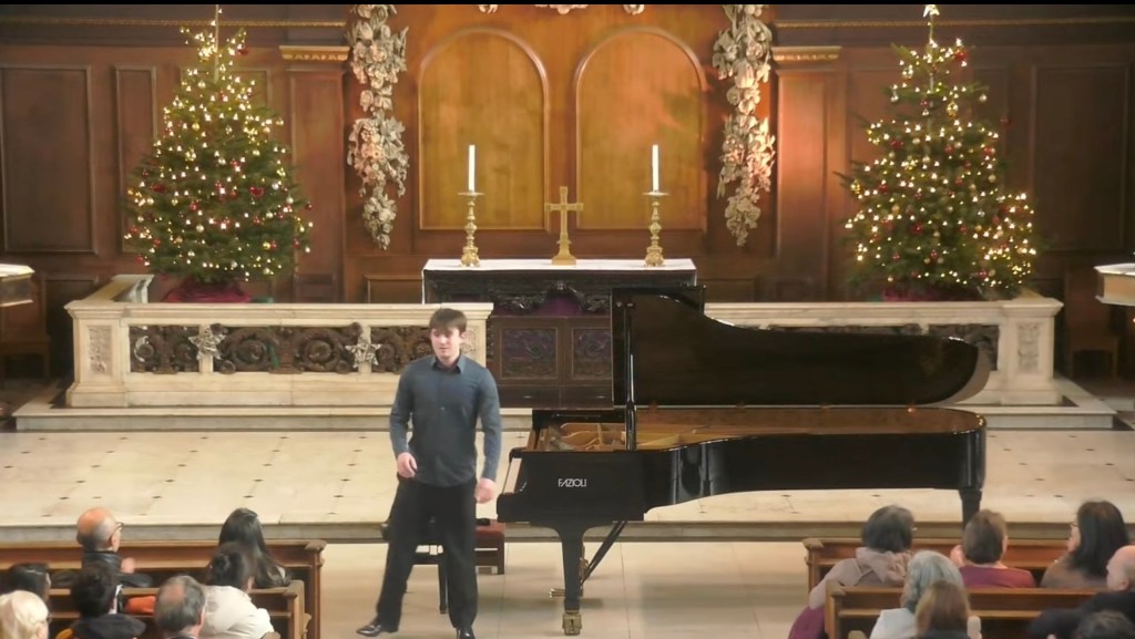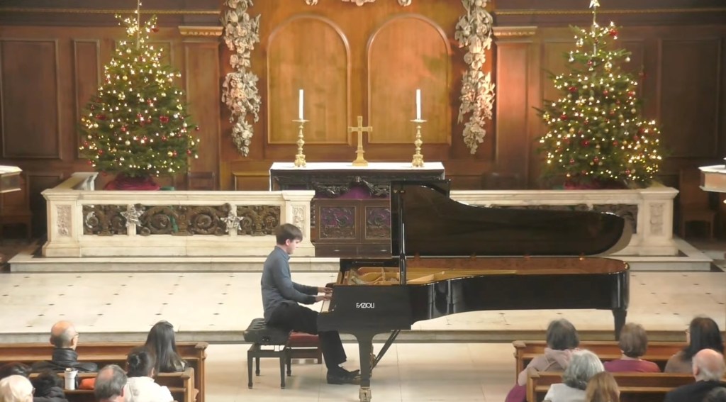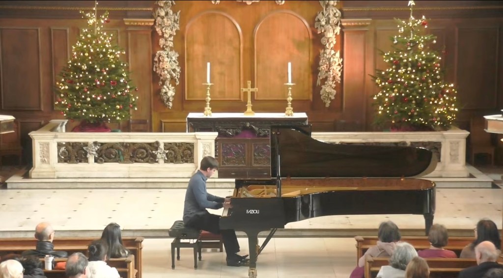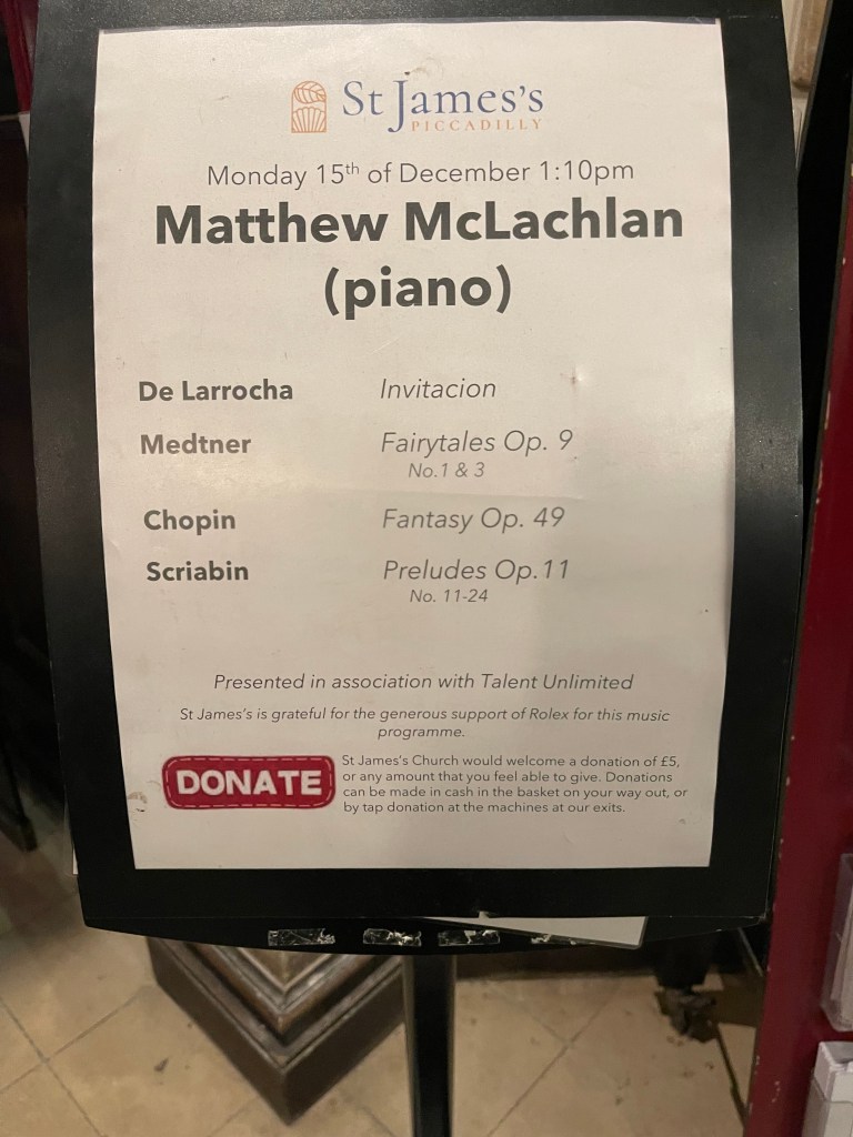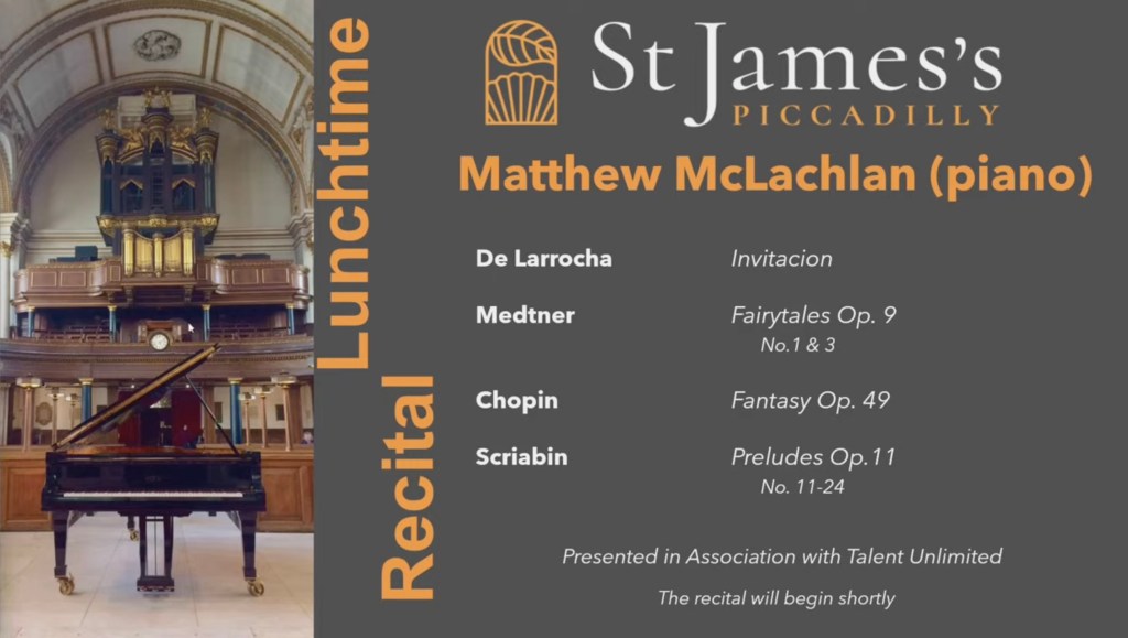 It was an equally modest young man today who played it with sumptuous sounds that entered so beautifully into the maze of notes that was to pour forth from the pen of Nicolai Medtner. Two fairy tales played with dynamic rhythmic drive with a passionate mellifluous outpouring and kaleidoscope of subtle colours. The very resonant acoustic of St James’s helping a composer sometime overloaded with notes but that in knowing hands can become clouds of sound out of which emerge a melodic line of jewel like beauty.