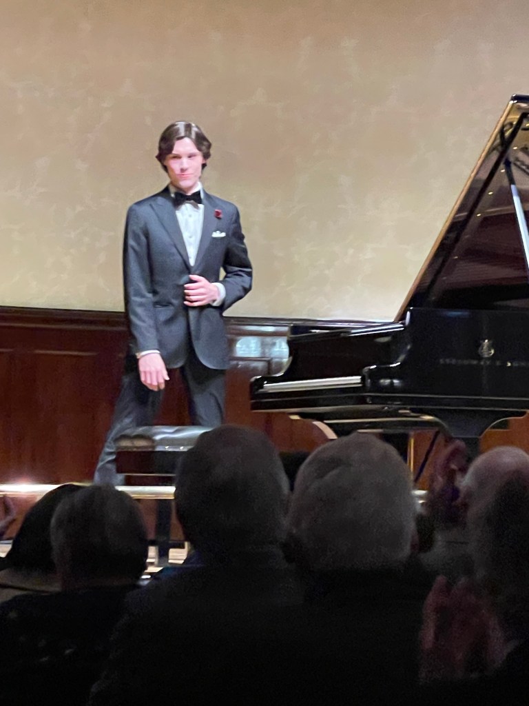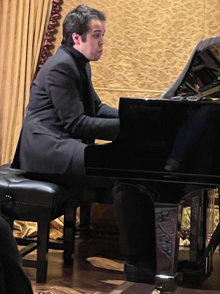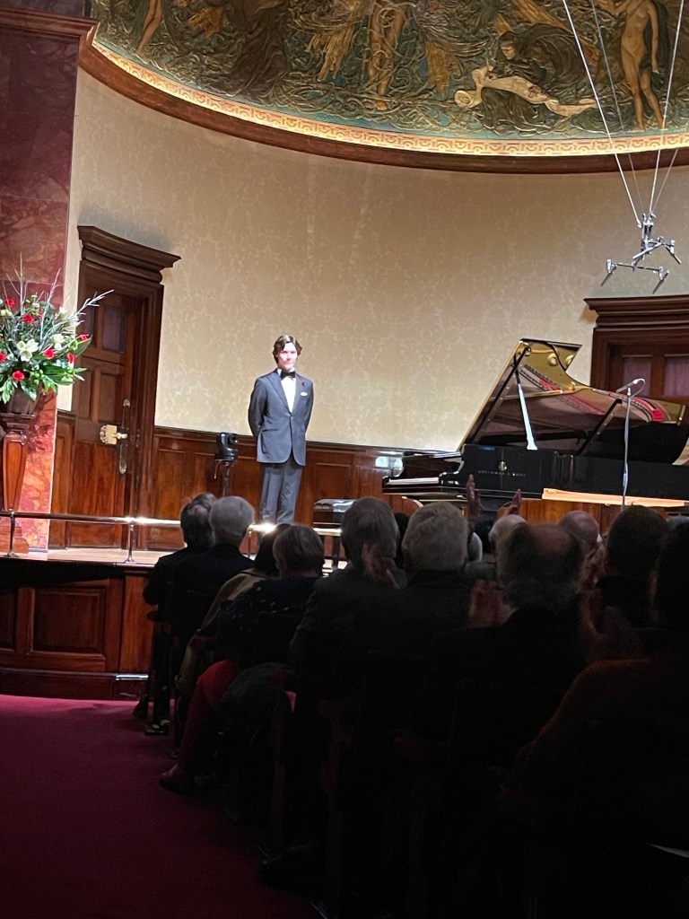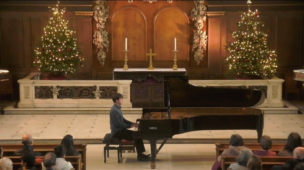 The first prelude immediately created an aura of magic as its whispered glowing utterances drew us in, to share the ravishing beauty that poured from Jaeden delicate hands with such simplicity and elasticity. Of course this was immediately dispelled by the startling nobility and agility of the second. A stream of sumptuous sounds on which Rachmaninov places a heroic exclamative melody . Sumptuous sounds that fade into the distance as a ravishing melody can be heard in its midst. A masterly sense of balance and transcendental technical control allowed Jaeden to shape the melodic line whilst creating an aura of Philadelphian sumptuousness . This was an oasis of radiance and beauty before unleashing the turbulent crescendo of emotions that heralds the return of the main theme, ever more triumphant and heroic, both technically and poetically speaking. It was in fact Jaeden’s technical mastery that paled into insignificance as the poetry and imagination completely consumed him. A capricious third prelude with a rare sense of balance and subtle almost jeux perlé lightness with the ending played with a beguiling insinuating simplicity like the elusive end of the Paganini rhapsody. A nonchalance that is too easy for children but too difficult for adults here found the perfect balance. There was a simple radiance to the beautiful melodic outpouring of the fourth, and although not as mysterious as Richter was of compelling beauty and masterly poetic content. The fifth in G minor was played at high speed, but of breathtaking brilliance and with a dynamic range and control that was masterly. The central unashamedly romantic outpouring was played with chameleonic colours that were allowed to intertwine with insinuating beauty. Again the nonchalant ending was played with absolute perfection.There was bewitching beauty to one of Rachmaninov’s most romantic outpourings in the sixth prelude that was played with a sense of rubato that held us mesmerised, as the melodic line was stretched to its absolute persuasive limit.The C minor Prelude that followed was played with etherial sounds of swirling energy like a wind on which arose with nobility the long melodic line gradually growing in intensity and sparkling brilliance. After such scintillating exuberance the nobility of the ending was played with aristocratic poise. The eighth prelude of continual shifting harmonies was played with etherial beauty as the bass became the anchor on which the wash of notes was linked. The demonic ‘feux follets’ of the ninth was played with an extraordinary legato as Jaeden turned technical impossibilities into beguiling gems of lightness and beguiling brilliance. The last prelude with it’s beautiful languid melodic line in the bass was played with a ravishing sense of balance as the voices duetted with each other with the poetic intensity that had characterised all ten of this first set of preludes op 23.