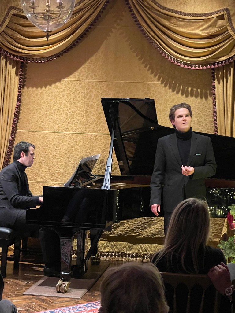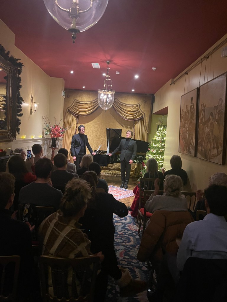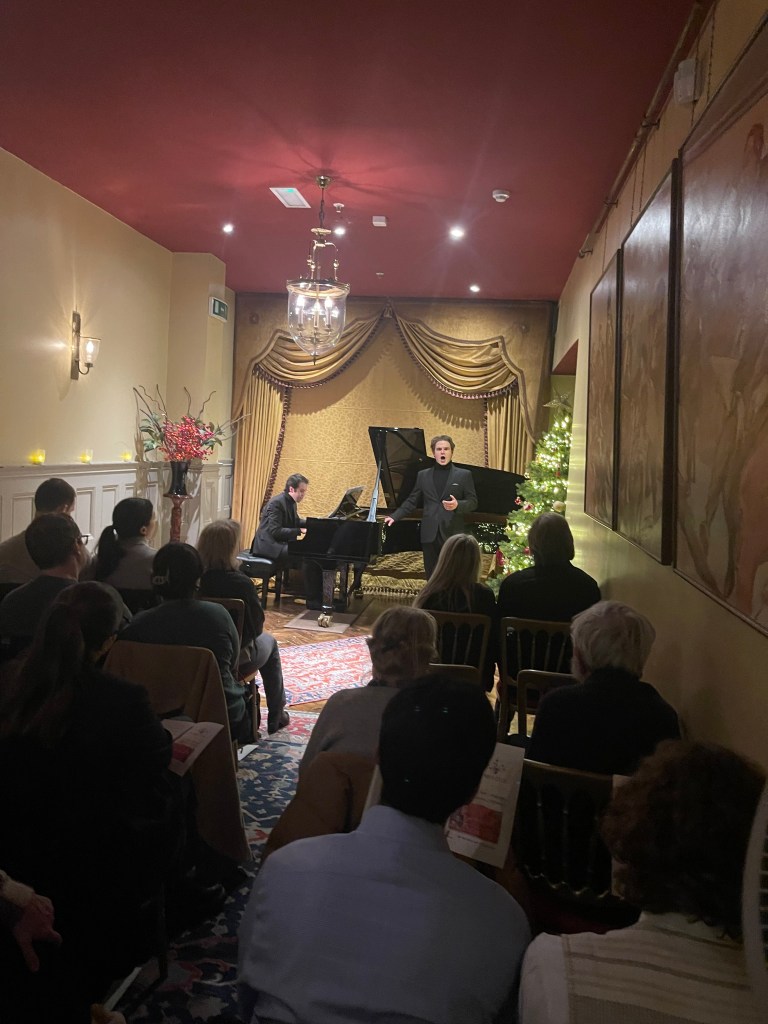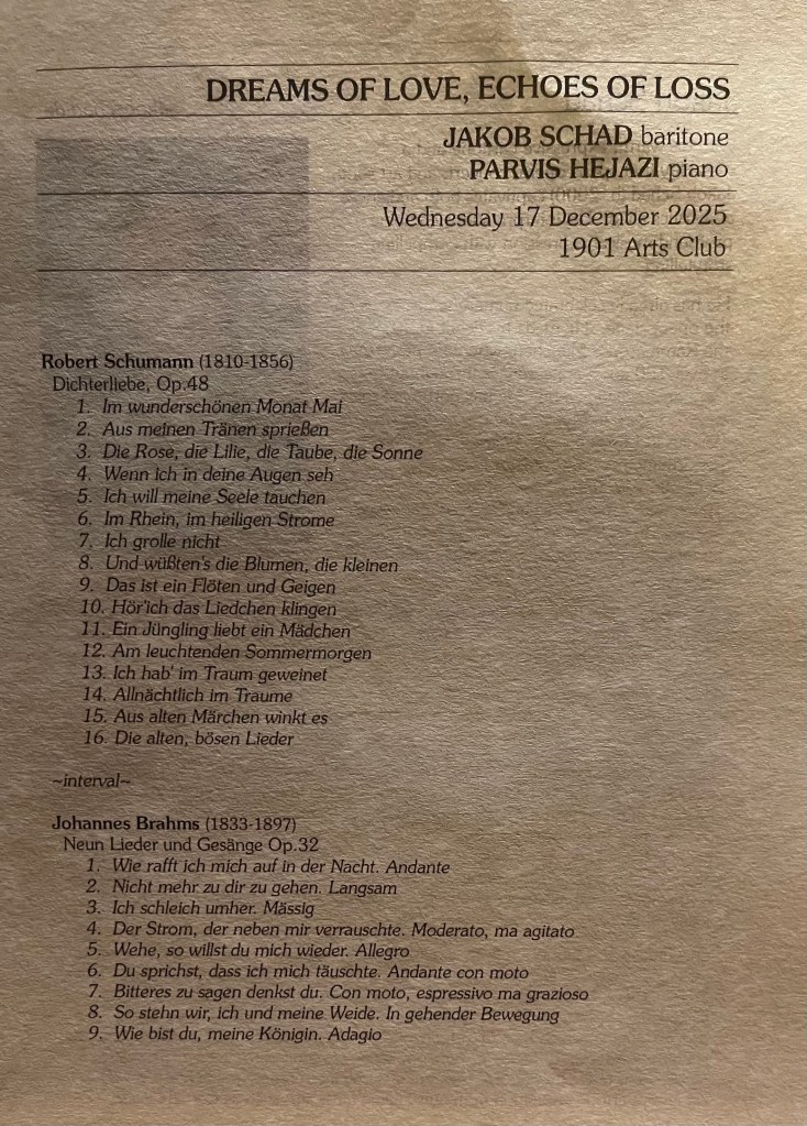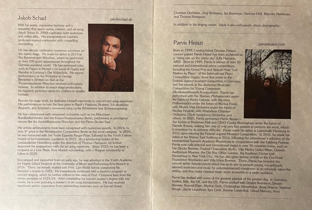 Jakob Schad and Parvis Hejazi Dreaming of Love with Echoes of Loss. Schumann’s Dichterliebe and Brahms Neun Lieder und Gesänge with a duo united as one, as magical sounds wafted around this beautiful candlelit salon with passionate intensity and poetic poignancy.
