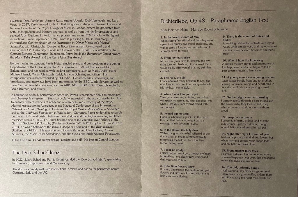 Jakob Schad’s superb voice need not fear having the piano lid wide open because not only does he have the power but also his pianist has the sensibility to blend together in the recreation of one of Schumann’s greatest song cycles.It was the equal mastery of both that was able to convey the deeply personal message in Heine’s poetry. Sometimes music can speak louder than words and after the poignant message of the voice it was the piano of Parvis that concluded and had the last ‘word’.