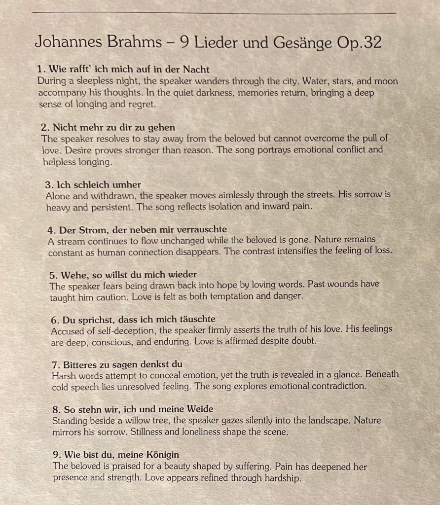 There is a strong case for thinking of Brahms’ Neun Lieder und Gesänge op 32 as a kind of latter-day Dichterliebe, or rather Komponistenliebe. The composer’s self-identification with the nine songs of Op 32, which feature lost love, isolation, nostalgia and amorous self abasement Aand his careful selection and dovetailing of five Platen settings and four Daumer, is very much a personal statement.