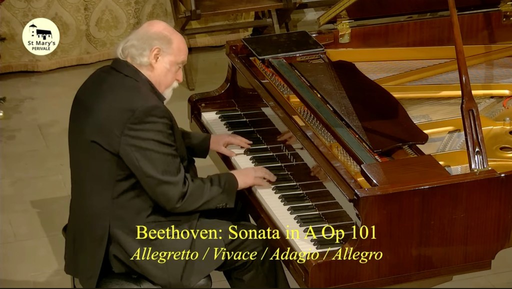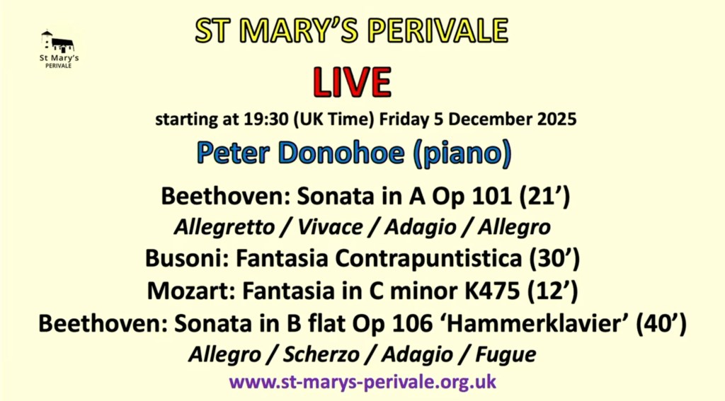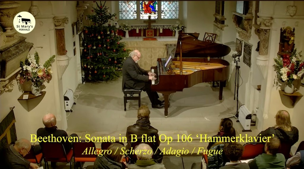It opens with a mighty fanfare and a treacherous leap, as this is a work where from the outset Beethoven shows us it is only for the fearless. Peter plays the first leap with one hand and the second with two which works very well as it shows fearlessness but not recklessness! A monumental performance of the ‘Allegro’, with of course the repeat of the exposition, and always with a driving undercurrent of energy that drove the music forward with clarity and luminosity.The opening of the development was bathed in pedal which contrasted so well with the clarity of the fugato that follows. Adding occasional deep bass notes, that Beethoven obviously intended, but did not have on the instruments of the day, it gave an aristocratic nobility to this most orchestral of opening movements. The ‘Scherzo’ was played with solidity rather than as a dance which contrasted well with the fluidity of the ‘Trio’.The ‘Adagio’ which is the very heart of this work was given a beautifully flowing tempo which did not exclude some exquisite moments, but always moving forward on a great wave of passionate intensity. All through this ‘Adagio’ there was a beauty of sound and a perfect sense of balance that allowed the melodic line to sing so naturally with a glowing luminosity of great poignancy. There was a rhythmic energy that gave strength to the architectural line where even the intricate embellishments were sustained by the inexorable inevitability of the bass. Peter made a very definite break between the ravishing end of this movement and before the improvised introduction to the mighty fugue that took flight with fearless virtuosity and dynamic drive. The difficulties just disappeared under Peter’s masterly hands as he drove the music forward to the final climax where he added even more notes to Beethoven’s mighty final chords. A monumental performance played with a musicianship where notes became just a means of expressing the impossible on an instrument that Beethoven had taken to its limit and beyond !