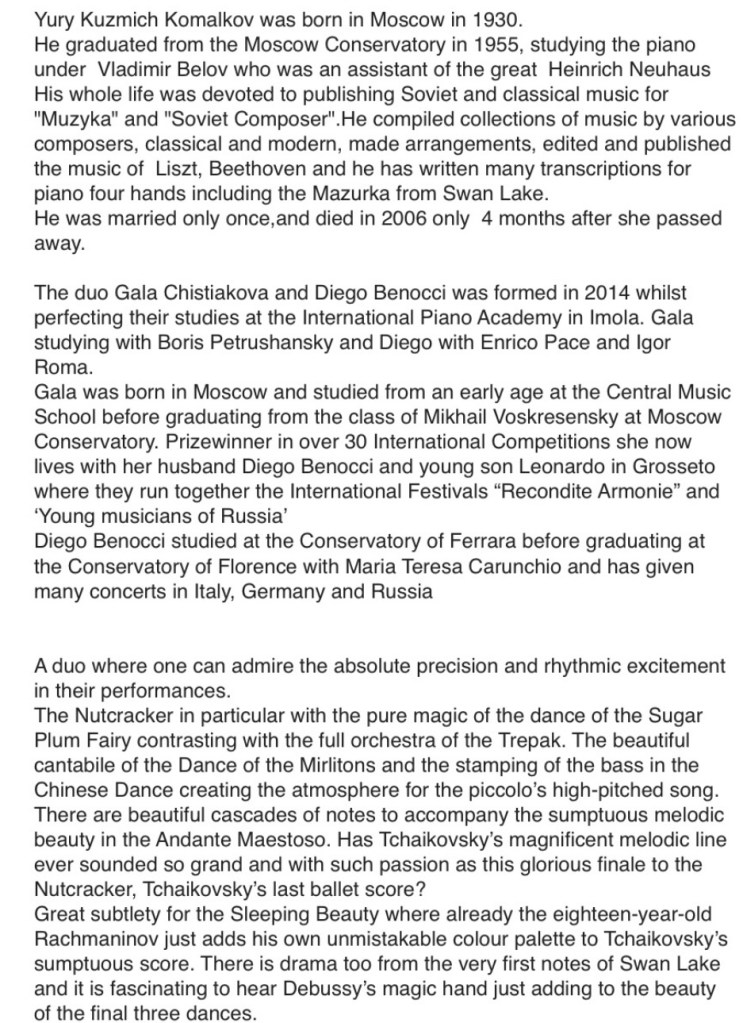 They not only perform but help to enrich the lives of young musicians with their encouragement and expert training which they had both acquired at the International Piano Academy of Imola, where they had met. Their first CD of Tchaikowsky has been acclaimed by the critics and they have just released their second with the complete piano duet works by Erik Satie.
