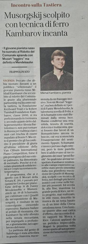 VICENZA — It’s a pity that the young Russian pianist Mikhail Kambarov performed before only a small “select” audience at the Ridotto of the Teatro Comunale, thanks to the long-standing partnership between Incontro sulla tastiera, the Keyboard Trust Foundation, and the Robert Turnbull Foundation.