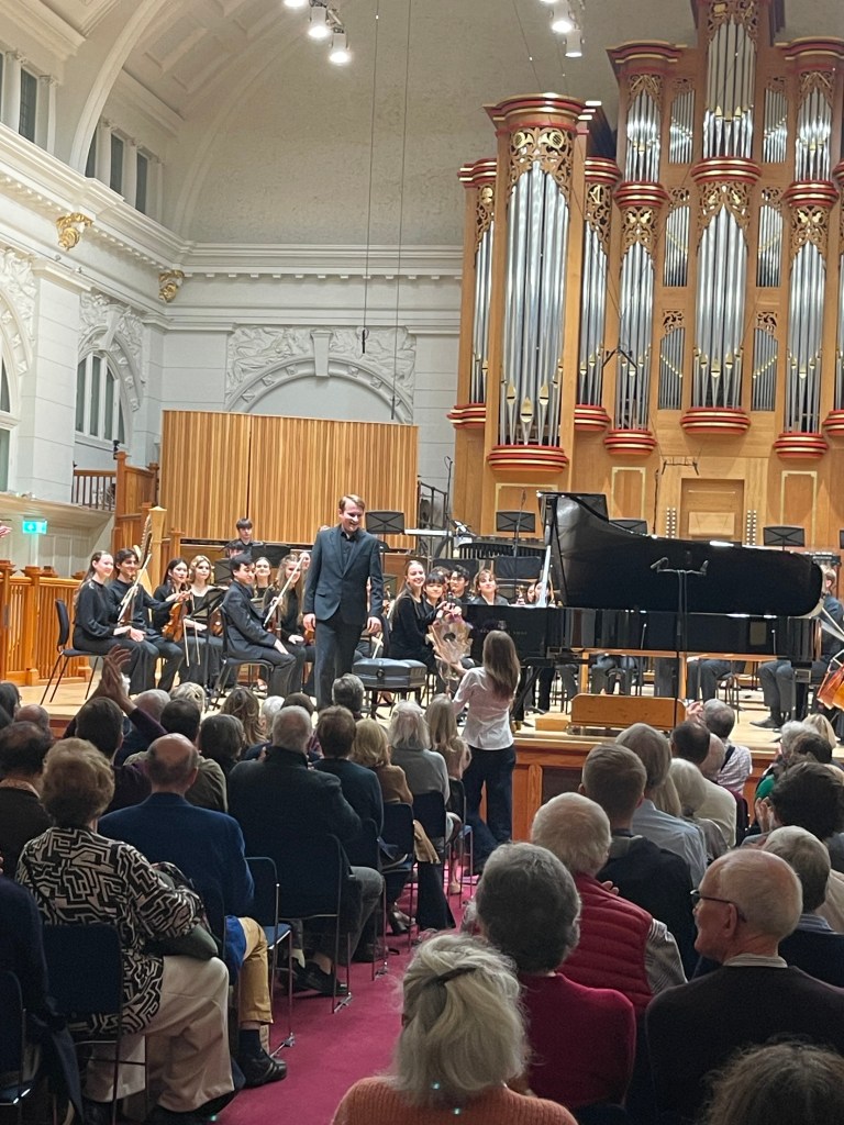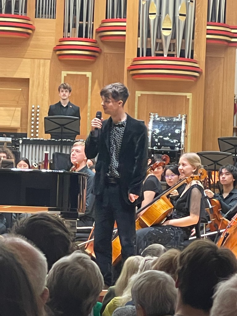 Misha Kaploukhii on his fourth outing with Brahms 2 tonight as prize winner at the Royal College of Music under the superb baton of Martyn Brabbins who also presented another prize winner Tom Bradbury with his composition ‘Treacle ‘