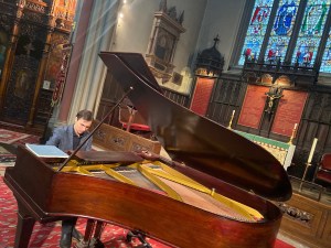 The grandiose opening to the Sonata broke the spell that he had created and brought us into the more sedate but passionate world of Brahms.A great sense of control and contrasts where one could almost envisage the whole orchestra.The solo horns alternating with the full sumptuous string section.This work in lesser hands can often seem fragmented and it takes a real musician to be able to see the whole line from the first to the last note without getting distracted by Brahms’s seemless melodic lines.The Andante was played with a sense of foreward movement where deeply felt sounds emerged with touching insight. The ‘Ben cantando’ section was even more mellifluous contrasting with the opening melodic line that had been deliberately subdued and the poco piu lento section was very beautiful indeed .One of the most touching moments though came in the Andante molto coda, where the gradual reawakening leads to a passionate outburst that dies away to a whisper as Debussy’s cathedral had done only moments before.The Scherzo was thrown off with great verve and a slight wrong turning was a small price to pay for a performance of such technical assurance.